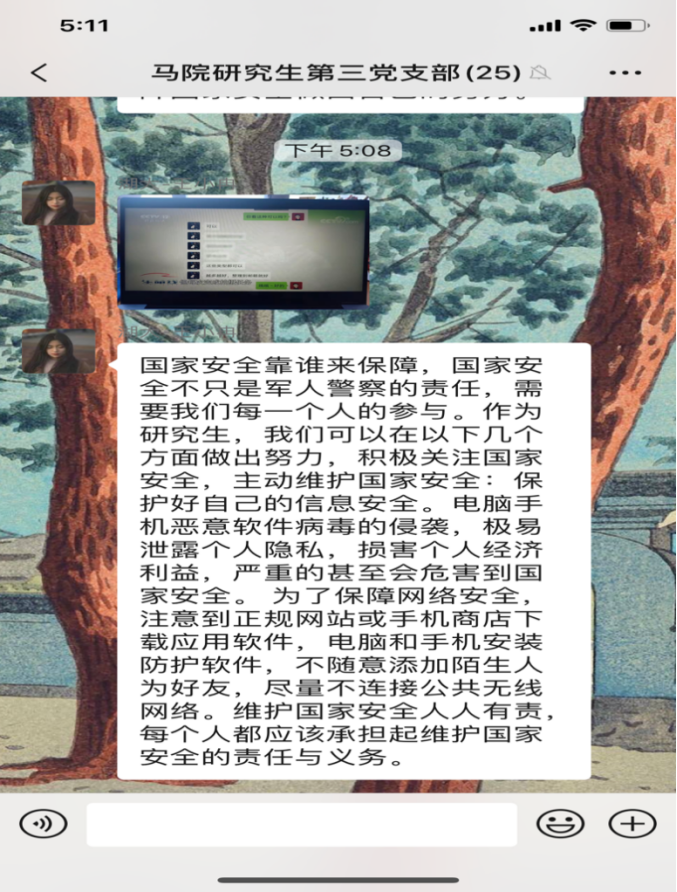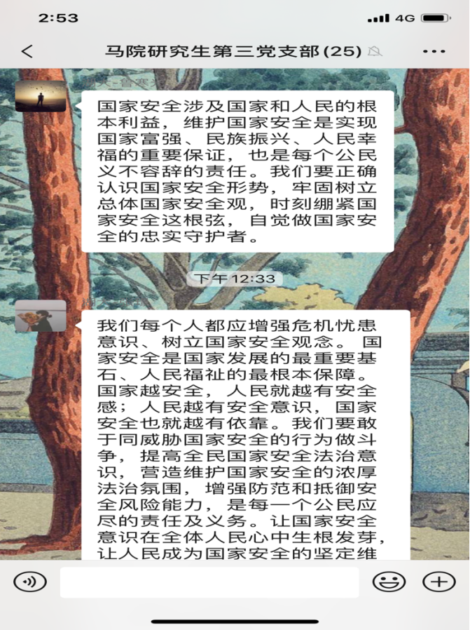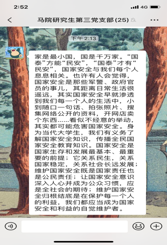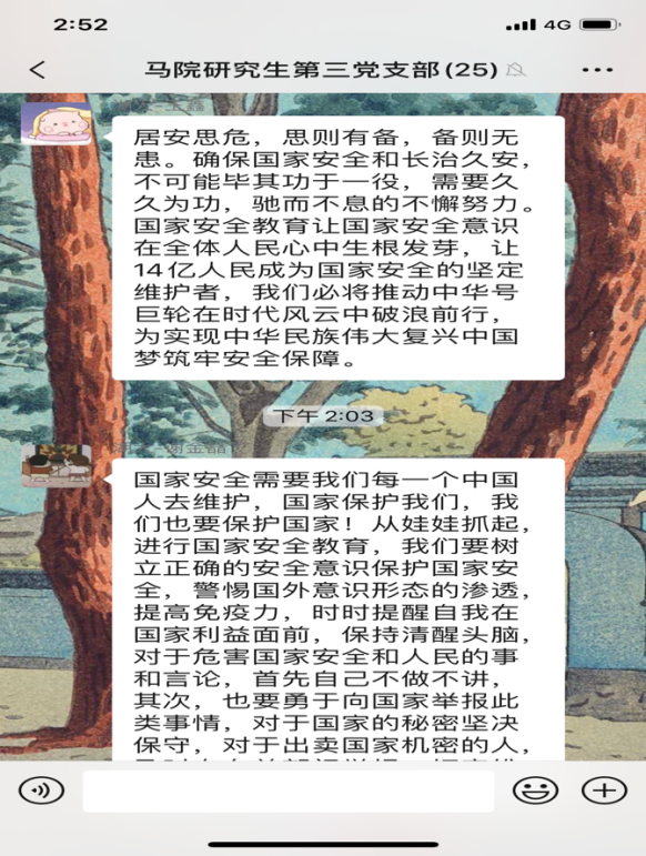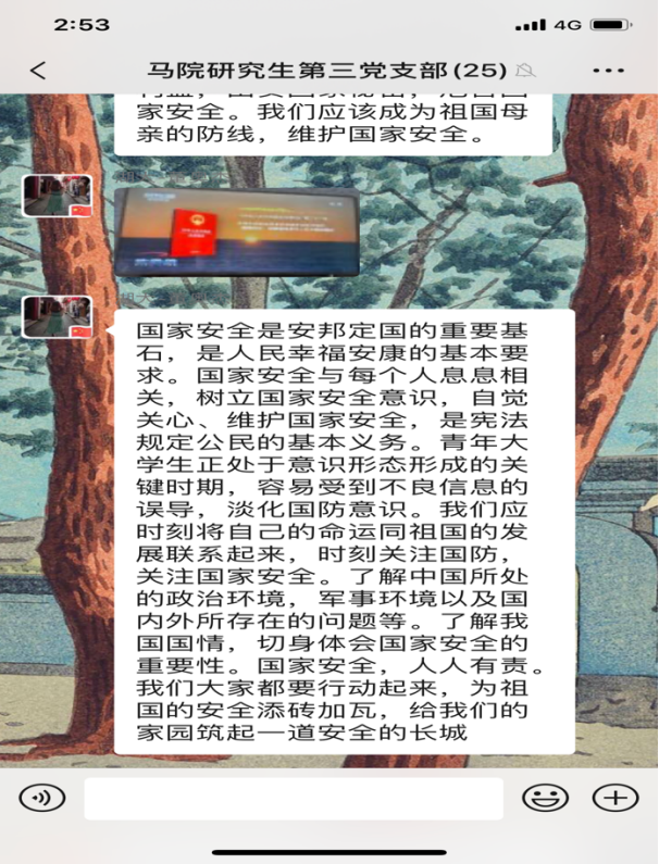 4月15日是第5个全民国家安全教育日,今年的活动主题是“坚持总体国家安全观,统筹传统安全和非传统安全,为决胜全面建成小康社会提供坚强保障”。为更好地开展国家安全教育,4月16日,williamhill威廉希尔研究生第三党支部开展4月份主题党日活动,全体党员同志观看《汇聚人民力量 维护国家安全》专题片。在观看后,同志们感触颇多,纷纷在支部微信群分享观后感。