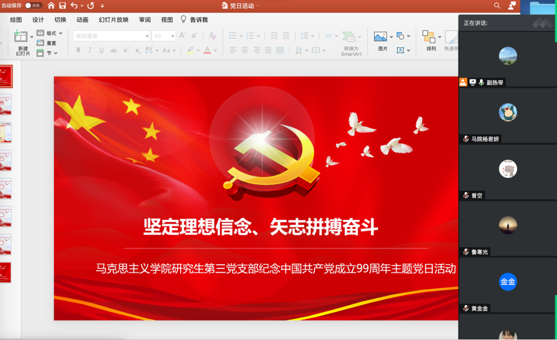 为庆祝中国共产党成立99周年,2020年7月5日,williamhill威廉希尔研究生第三党支部在腾讯会议开展了2020年7月份主题党日活动,主题是坚定理想信念、矢志奋斗拼搏。支部全体同志参加了活动,活动由党支部书记高宇航主持。