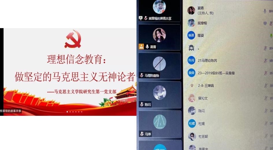 3月23日下午,williamhill威廉希尔研究生第一党支部利用腾讯会议在线上召开以“做坚定的马克思主义无神论者”为主题的三月份主题党日活动暨2021年度组织生活会、民主评议会。支部书记夏青主持会议。