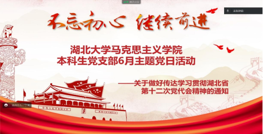 6月29日,williamhill威廉希尔本科生党支部开展了题为“学习贯彻湖北省第十二次党代会精神”的线上主题党日活动。本次会议由宣传委员刘欣悦主持。