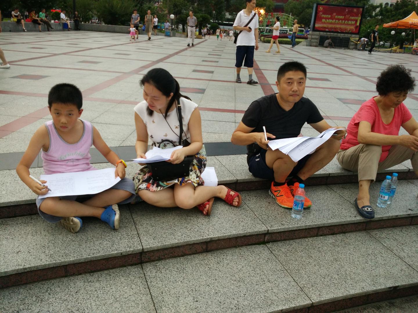 西陵社区位于宜昌市繁华闹市,由于社区广场上休闲人数较多,我们立即兵分三路,尽可能保证在天黑之前完成更多的有效调查问卷。西陵社区的居民不仅热情而且积极配合我们的工作,有的居民直接蹲在地上一笔一划填写我们的调查问卷,有的员工主动找我们要调查问卷填写,虽然他们可能不太了解社区文化的真正内涵,可是他们饱满的热情深深地感染了我们,也让我们对宜昌市西陵社区的文化建设有了全新的体悟。