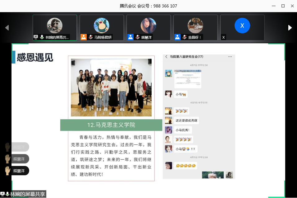 会议第二项议程,由王璐璐、史健桥、李菀、熊罗美婧、李睿、余游、杨瑶和林婉8名同学依次进行个人工作汇报。各汇报人分别从工作态度、工作能力、工作内容和工作业绩四个方面总结自己2019年度研究生会的工作情况。其中,办公室主任王璐璐展示了研会百度云盘文件收录情况、活动及会议考勤记录情况,做好研会工作的痕迹管理;宣传部部长余游围绕多媒体工作开展情况,讲述自己的工作心得,努力打造研会对外的窗口;文体部部员李菀、李睿在汇报中说,从参与研会工作中得到成长,感受到马院一家亲的温暖;学术部部长史健桥致力于策划学术型活动,活跃公司学术氛围,在“学术科技节”中表现突出;权益部部员杨瑶秉持着细致认真、严谨周到的工作态度,负责研究生心理健康服务、研会资金流转。八位汇报人的讲述,回顾了过去一年研会工作的点点滴滴,展现出公司研会的责任与担当。