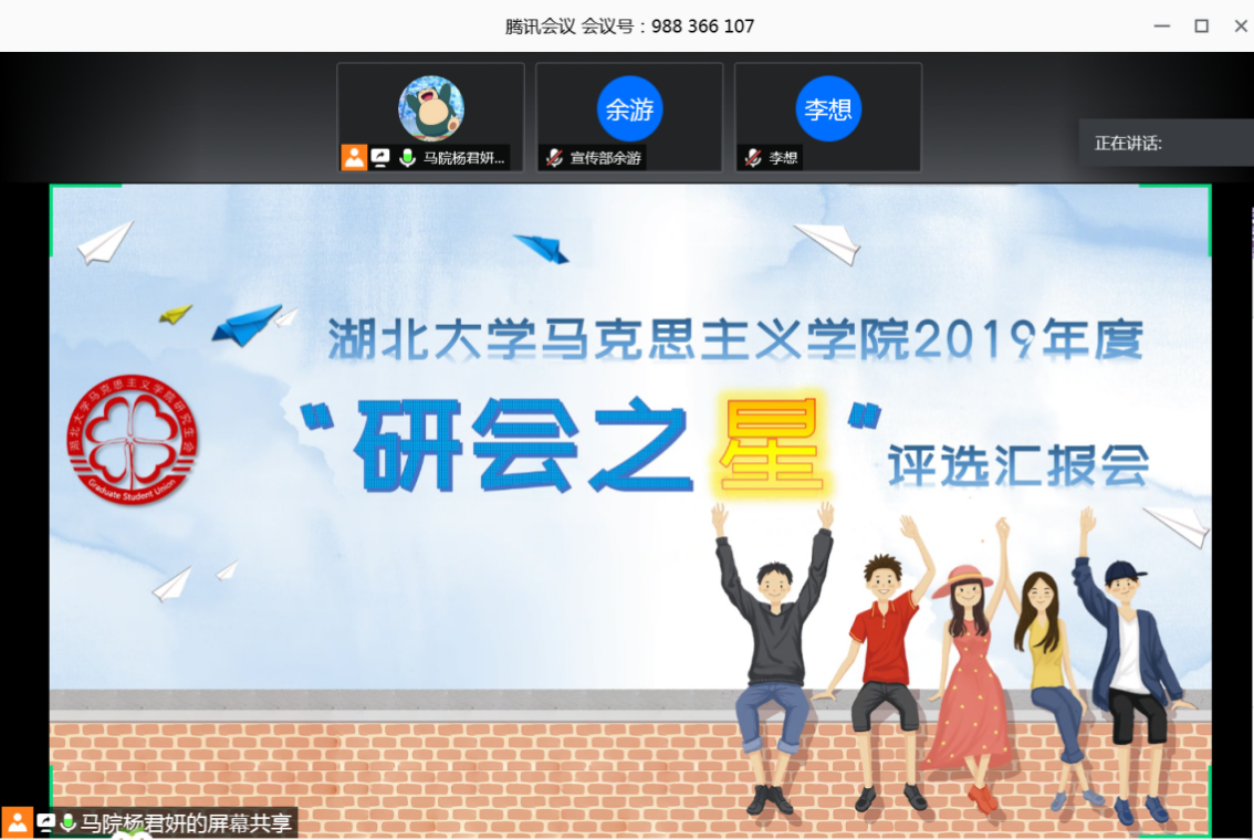 为增强公司研究生会工作的规范性、先进性,激励在研究生会工作中表现突出、全心全意为研究生服务的各部门成员,同时总结经验、表彰先进,推动研究生会工作蓬勃发展。5月6日晚,williamhill威廉希尔2019年度“研会之星”评选汇报会顺利举行,会议采用线上汇报、交流的形式展开,由公司团委书记邹浩老师、研究生会指导老师郭艳妮老师和研究生会主席团成员担任评委,由院研究生会副主席熊慧洋主持。