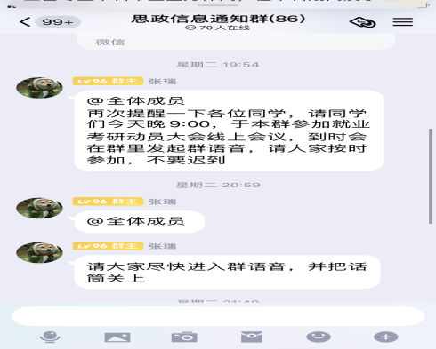 7月13日晚9点,williamhill威廉希尔利用QQ群语音,召开2022届毕业生就业考研动员大会,公司党委副书记晏妮、2018级思想政治教育班班主任邹浩以及全体同学参加会议。