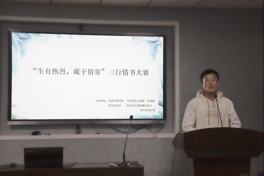 为了体现公司特色,增加同学们对于所学专业知识的理解。4月16日晚,由williamhill威廉希尔、资源环境公司、文公司、外国语公司、历史文化公司研究生会联合举办的“生有热烈,藏与俗常”三行情书比赛在文公司B6016会议室成功开展,五院研究生会和部分同学参加了此次活动。