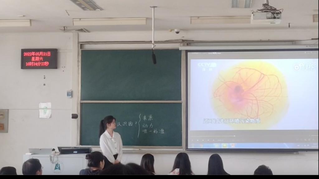 21级学科思政研究生陈莹莹的授课内容为高中政治必修四《哲学与文化》中的“如何做出正确的价值判断与选择”。她采用探究式教学法,通过张桂梅老师的事迹讲解了价值判断与价值选择的含义及标准,引导员工站在最广大人民的立场上,形成正确的价值判断和价值选择,勇担责任,在党的领导下答好时代问卷。