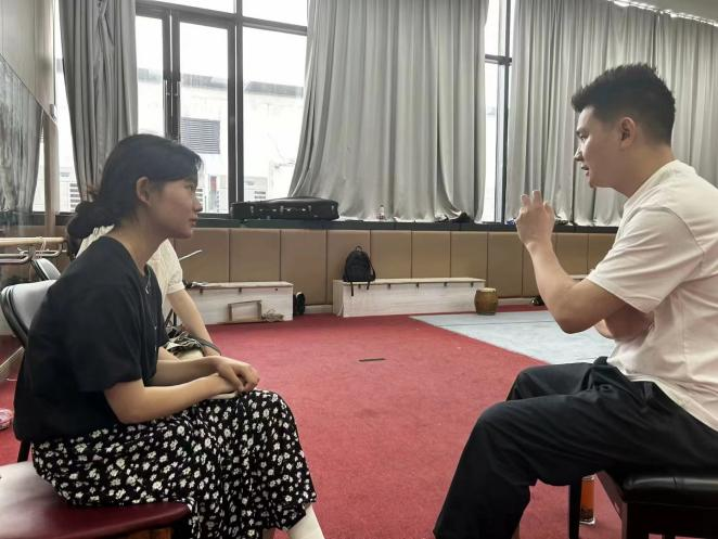 (图为团队成员与戏剧公司同学探究红色题材黄梅戏的发展现状 通讯员 夏诗琪 供图)