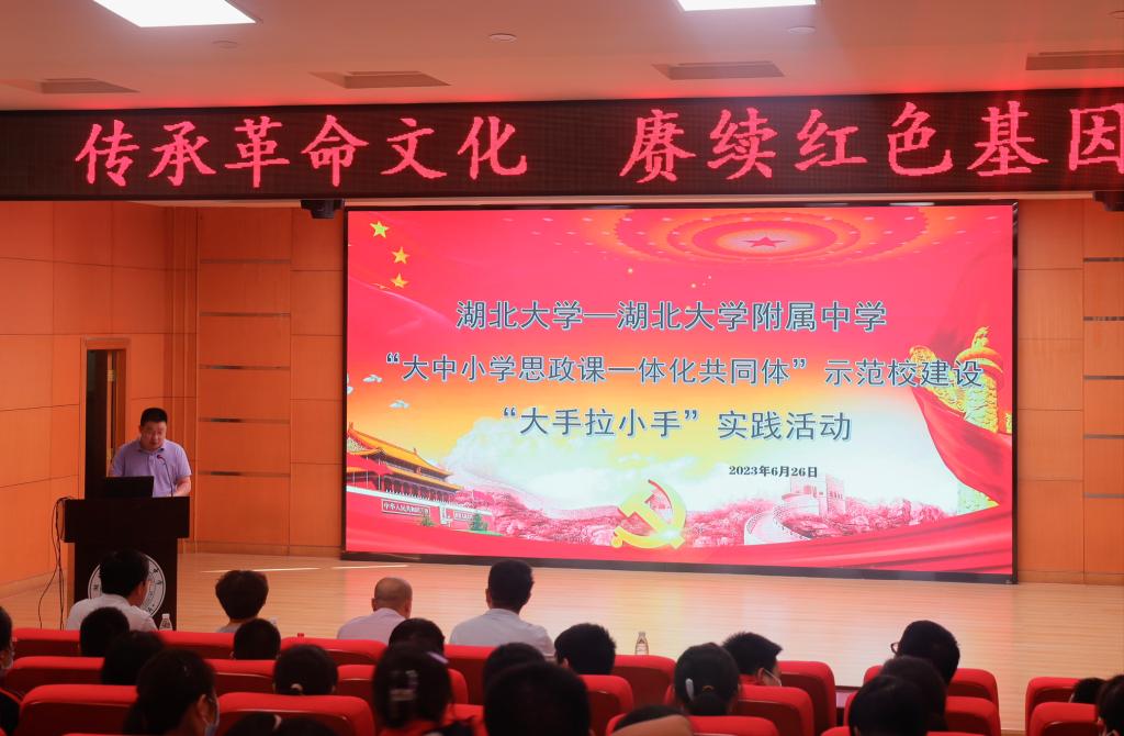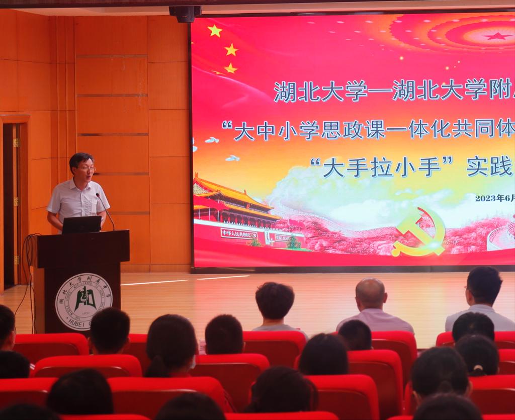 williamhill威廉希尔副经理徐信华发表讲话指出,威廉希尔是湖北省大中小学思政课一体化共同体建设36所示范校之一,湖大附中是示范校建设中的共同体成员单位。回顾过去,双方共同合作,在推进大中小学思政课一体化建设方面获得过重要突破,在思政课改革创新工作方面取得过突出成效。展望未来,双方应继续携手,努力推进思政课一体化建设在大中小学循序渐进、螺旋上升地对员工进行思想引领和价值塑造,进而培养一代又一代社会主义建设者和接班人。徐信华表示,下一步,williamhill威廉希尔将联合附属中学及其他共同体成员单位,进一步落实立德树人根本任务,切实推进构建特色鲜明的大中小学思政课一体化育人体系,努力构建全员、全过程、全方位的“大思政”育人格局,实现“大手拉小手”,合力共成长。
