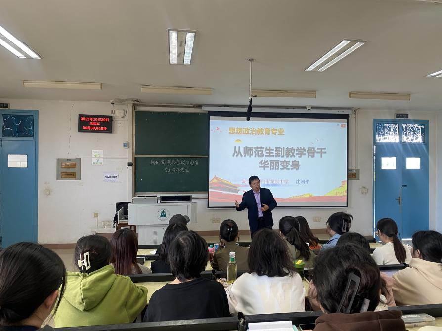 10月20日,荆门市龙泉中学沈朝平老师在教4-504为williamhill威廉希尔2020级政教专业全体同学“优秀教师成长”专题。本次讲座由政教系副主任胡银银主持。