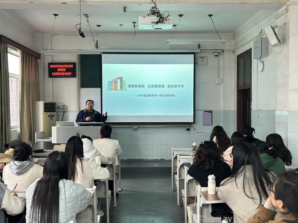 黄志平老师以“新课标、新课堂、新评价”为主线,结合自身丰富的教学和研究经验,从“以始为终,看‘三新’联系”、“领悟新课标,发现修订变化”、“立足新课堂,创新教学方式”、“适应新评价,研究中考试题”这四方面,给同学带来了内容丰富、内涵深刻的讲座。讲座中,黄老师和同学们分享了《坚持宪法至上》大单元教学设计案例,他展示了“目标分解-逻辑递进-价值建构”的实施路径,通过课时目标梯度设计夯实认知基础,借助学科观念统整知识点,实现核心素养的内化生成。他强调大单元设计需把握三个关键:一是主题活动中设计问题要处于认知基础与学科观念的认知点上;二是情境任务中要提供连贯的有重点的生成学习;三是作业与评价中要促进反思与建立知识关联,以此来实现教学评一体化进阶。