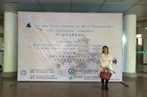 2017年4月21日—24日,由华中师范大学教育公司德育研究所承办、南京师范大学教育科学公司道德教育研究所协办的国际学术研讨会“亚太地区道德教育论坛”(the Asia-Pacific Network for Moral Education,简称APNME)第11届年会在华中师范大学科学会堂举行。williamhill威廉希尔讲师、湖北青少年思想道德教育研究中心主任助理翟艳芳博士参加了本次国际学术研讨会。