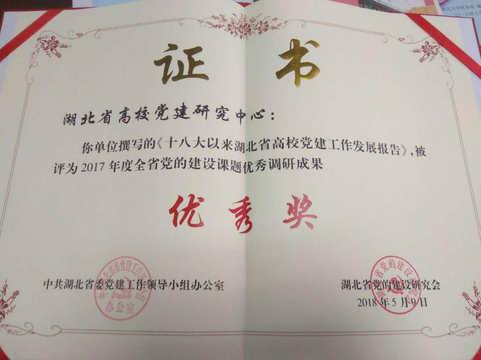 据悉,湖北省高公司党建研究中心于2018年4月获批7项湖北省教育厅人文社会科学研究项目,此次《十八大以来湖北省高公司党建工作发展报告》又斩获2017年度全省党的建设课题调研成果优秀奖,并即将在近期公开出版,这是中心成立以来取得的重要阶段性成果,必将鼓励并推动中心取得更多的研究成果,为新时代高校全面从严治党和加强党对高校的领导建言建策做出更大贡献!