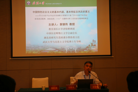 在会议的第一阶段,湖北省研究生思政课分教指委主任、教育部长江学者特聘教授、武汉大学williamhill威廉希尔袁银传教授作了题为《中国特色社会主义的基本内涵、基本特征及其历史意义——学习习近平总书记在省部级主要领导干部“学习习近平总书记重要讲话精神,迎接党的二十大”专题研讨班上重要讲话精神的体会》的主旨报告。湖北省研究生思政课分教指委副主任、华中师范大学williamhill威廉希尔副经理毛华兵教授作了题为《习近平新时代中国特色社会主义思想对马克思主义的原创性贡献》的主旨报告。