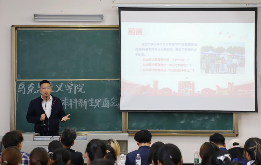 教师代表、新生班主任王昊发言。他围绕思想政治教育学科发展历史、学科背景、研究重点、核心素养等方面向同学们详细介绍相关情况。他强调,同学们不仅要注重本学科专业知识学习,还要注重思政相关学科知识的学习,在学习中做到融会贯通,立志成为专业复合型人才。