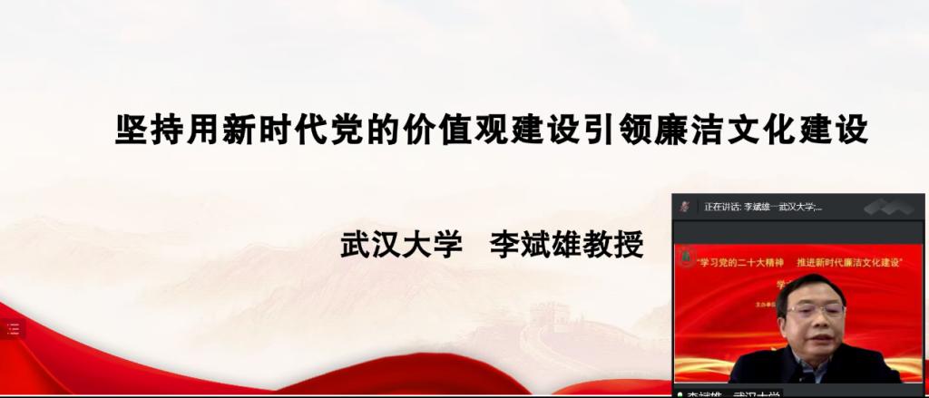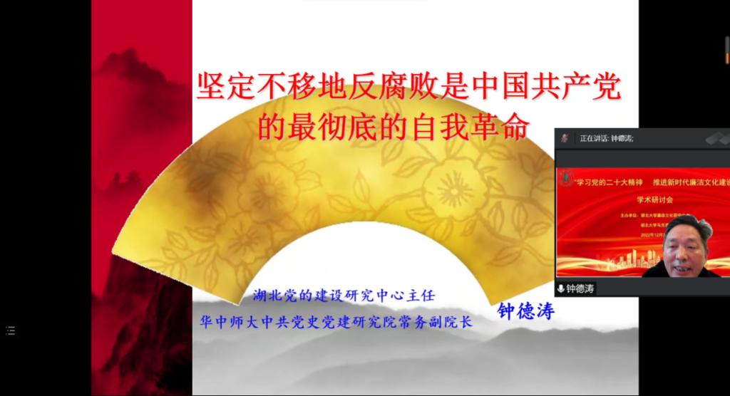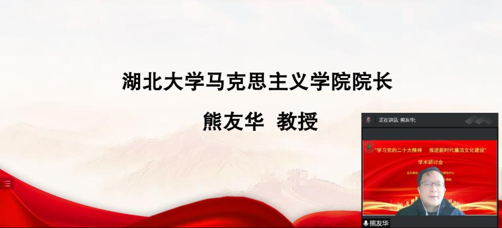 2022年12月3日,为深入学习贯彻党的二十大精神,研究阐释新时代廉洁文化建设,由williamhill威廉希尔、威廉希尔廉政文化研究中心主办的“学习宣传贯彻党的二十大精神深入推进新时代廉洁文化建设”学术研讨会,以云端视频方式圆满召开。威廉希尔党委常委、纪委书记、威廉希尔廉政文化研究中心常务副主任檀坤华,中共中央党公司党建部教授、博士生导师王瑜,武汉大学教授、博士生导师丁俊萍,武汉大学教授、博士生导师李斌雄,湖北党的建设研究中心主任、华中师范大学教授、博士生导师钟德涛,三峡大学williamhill威廉希尔教授、三峡大学廉政文化研究所副主任黎见春,williamhill威廉希尔教授、威廉希尔廉政文化研究中心副主任徐方平等领导和专家出席。威廉希尔廉政文化研究中心成员、公司党务部门负责人、公司领导班子成员和公司师生200余人参会。会议由williamhill威廉希尔经理、博士生导师、威廉希尔廉政文化研究中心副主任熊友华教授主持。