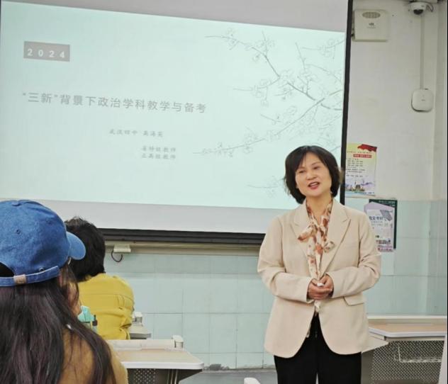 高海英老师的讲座主题是《“三新”背景下政治学科教学与备考》,这一主题是当下备受关注的教育话题。高老师结合自身丰富的教学与研究经验,从深度学习“三段四环”教学模式、介绍新高考、高中政治教师应具备的能力、高中政治活动性课程的开展等方面展开论述。高老师指出,在“三新”背景下,政治老师要明确教学方向、转变教育观念、落实教学任务,借助活动讲好新课,真正做到课程内容活动化,活动设计内容化。