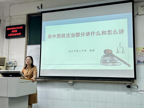 陈丽老师讲座的主题是《高中思政课法治部分讲什么和怎么讲》,这一主题是当下备受关注的教育话题。讲座伊始,陈老师结合自身丰富的教学与研究经验,就教材必修三《政治与法治》的单元内容设计意图、内在逻辑意蕴及高考命题思路等方面,为同学们作出深入系统的讲解。陈老师指出,要想讲好《政治与法治》部分,教师必须要仔细研读课标,立足教材,把握好课堂宏观架构,梳理清知识逻辑体系,提升讲课的底气。同时教师要关注常识性知识,关注法条背后的情理,使教学凸显法治的温度。
